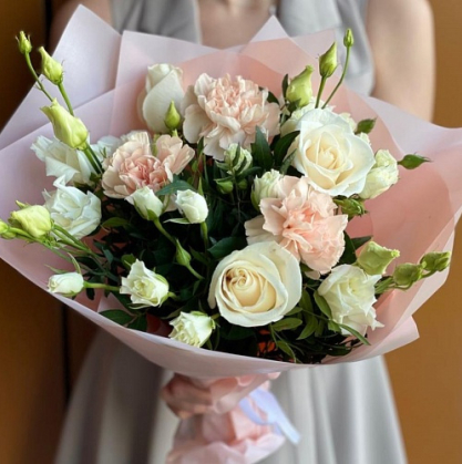Букет состоит из нежных белых роз, роскошных кремовых диантусов и элегантной эустомы. Розы символизируют любовь и чистоту, диантусы означают благосклонность и верность, а эустома - красоту и гармонию. Такой букет - идеальный вариант для важного мероприятия или как подарок для любимой девушки.
