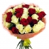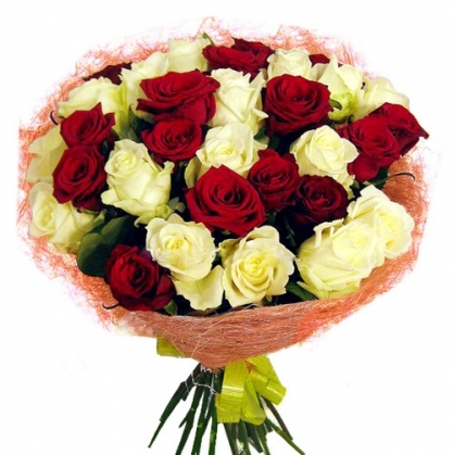 Гармоничное сочетание цветов роз белого и красного цвета в натуральной упаковке