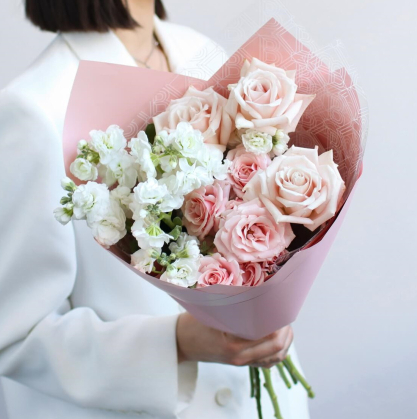 Букет из маттиолы и розы в стильной упаковке.