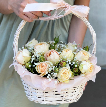 Корзина с кустовыми пионовидными розами и гипсофилой