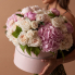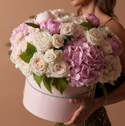Большая коробка цветов. В состав входят горнензии, пионы, одиночные и кустовые пионовидные розы. Все в светло-кремовых тонах. При этом количество каждого цветка вы можете изменить самостоятельно.